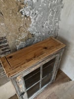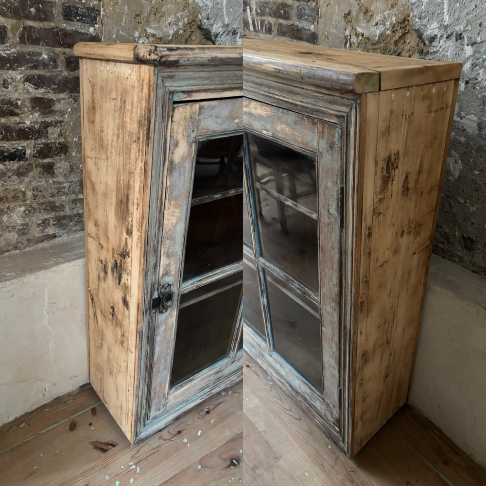 Magnifique vitrine à poser ou à suspendre, une porte avec verrou en bois blanc et verre d'origine sur la porte. Deux étagères intérieures.
